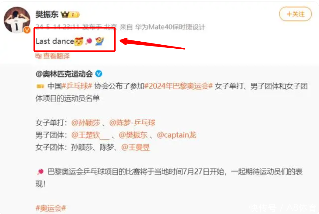 目前最伤心的应该是樊振东的球迷!晚上的11点,樊振东转发了国乒巴黎奥运会的参赛名单并晓谕了不测的决定,樊振东示意:“Last dance”!等于临了一舞的意旨真谛!樊振东如斯表态未免让外界感到特殊不测,难说念巴黎奥运会是樊振东的谢幕之战,他有了退役的念念法!樊振东如今27岁赶巧当打之年,要是樊振东在这个时候取舍退役,关于寰宇乒坛以及国乒来说齐是一大亏本!樊振东此前接管采访的时候曾说过他有可能会和马龙一说念退役,其时寰球以为樊振东是在开打趣,毕竟他比马龙年青了9岁,但如今樊振东的这番表态,让寰球负责了起来,也许樊振东果然念念归隐了!